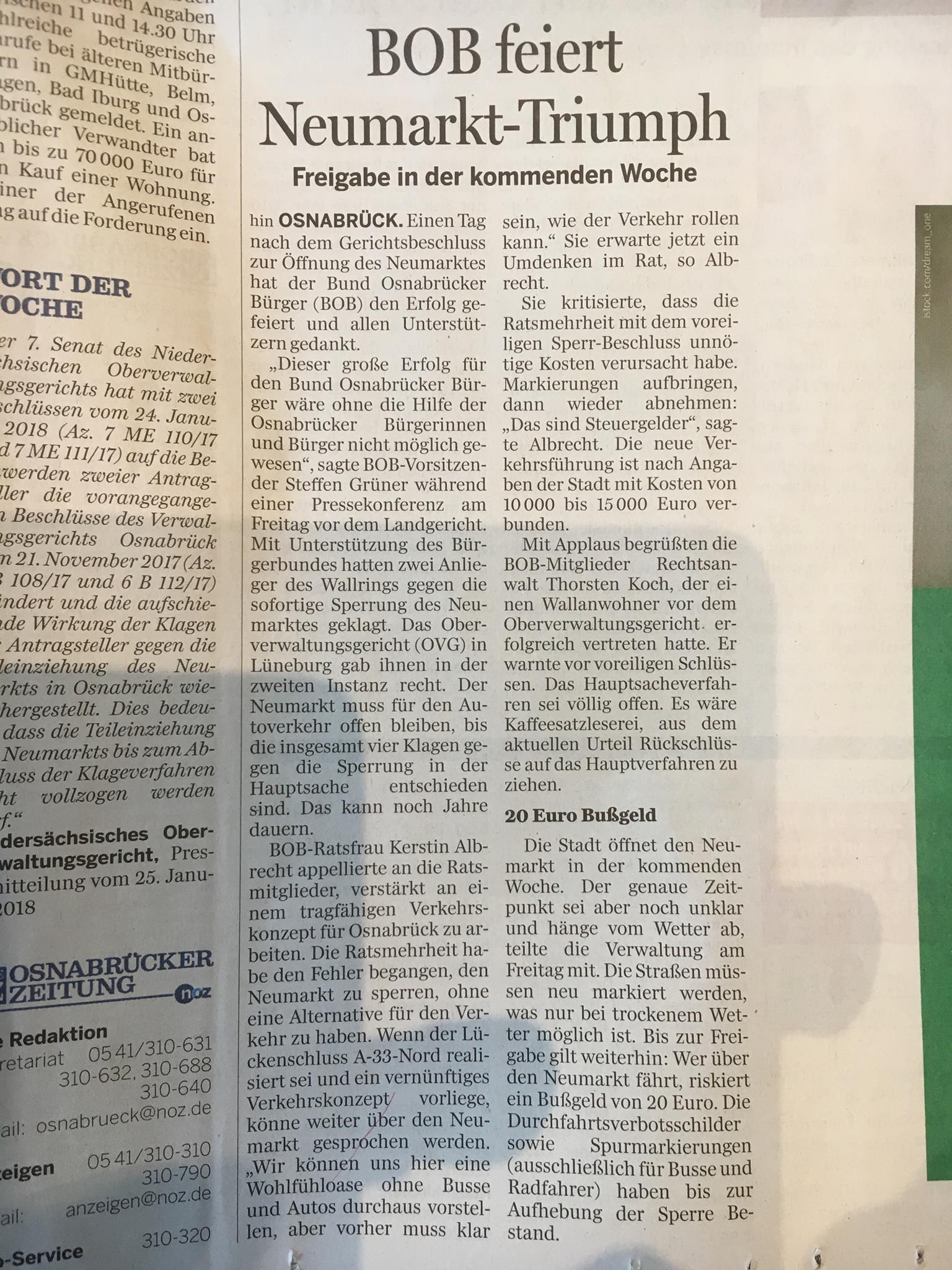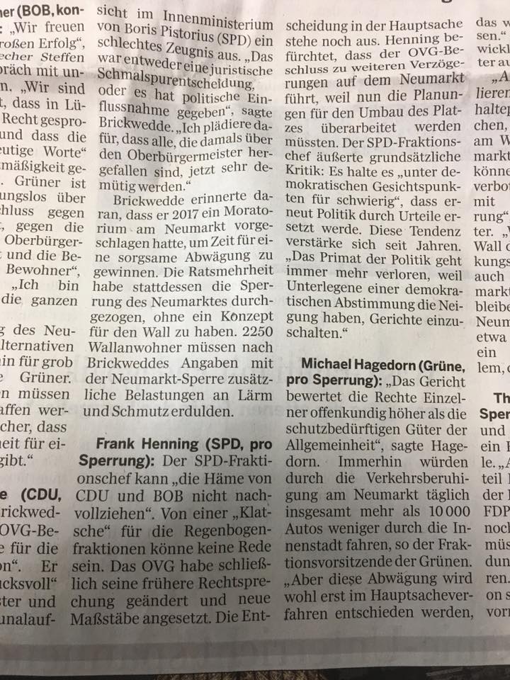 „Für uns ist es ganz klar: Diejenigen, die es am Neumarkt versiebt haben, dürfen nicht mit der Zukunft des Neumarktes betraut werden. Die Grünen haben damals das Ende des Neumarkttunnels ausgelöst und damit die darauffolgende Misere des Neumarktes mit verschuldet. Damit nicht genug: Danach drückten die Grünen und andere Parteien mit Hilfe eines Gefälligkeitsgutachtens über die Kanzlei des damaligen Investors die Neumarktsperrung im Stadtrat durch. Wohlgemerkt gegen die Empfehlung des städtischen Rechtsamtes und gegen den Willen vieler Osnabrückerinnen und Osnabrücker, deren schlimmste Befürchtungen durch die Verlagerung des Verkehrs vom Neumarkt auf den Wall und in die Wohngebiete danach bestätigt worden sind.“ so Dr. Steffen Grüner vom BOB. Erst der Bürgerbund habe mit seiner Klage vor dem OVG Lüneburg die widerrechtliche Sperrung aufgehoben.