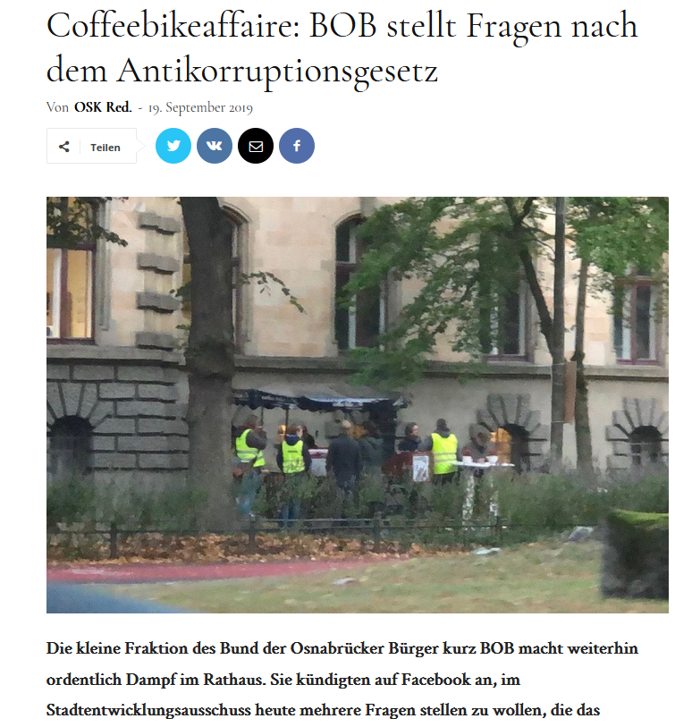 - Der Stadtbaurat will über das Rechtsamt der Stadt Osnabrück die BOB Wahlwerbung prüfen lassen. BOB rät dem Stadtbaurat, dies über einen privaten Rechtsanwalt und nicht zulasten der Steuerzahler Osnabrücks zu tun, um sich nicht wegen möglicher Complianceverletzungen erneut angreifbar zu machen (coffeebikeaffaire).