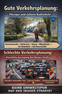 Die Debatte zeigt zudem ein strukturelles Problem im Radentscheid Osnabrück: Die Initiative hält weiterhin an der Iburger Straße als zentraler Radverkehrsachse fest – einer hochbelasteten Hauptstraße, auf der sichere Lösungen nur mit erheblichen Eingriffen möglich wären. Wir sprechen daher eine klare Absage aus, auch dem Vorschlag, die Straße nach dem Modelprojekt erneut auf Tempo 30 zu begrenzen.